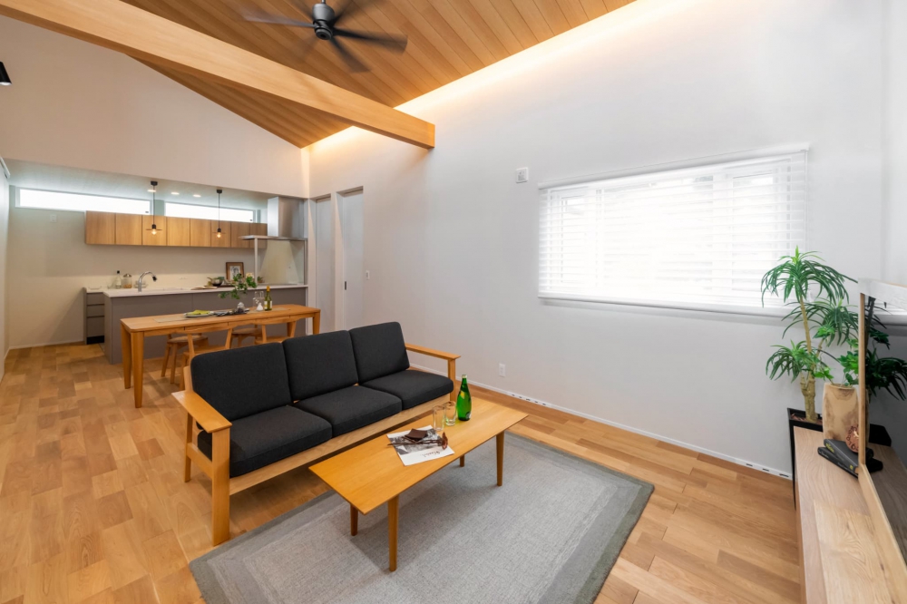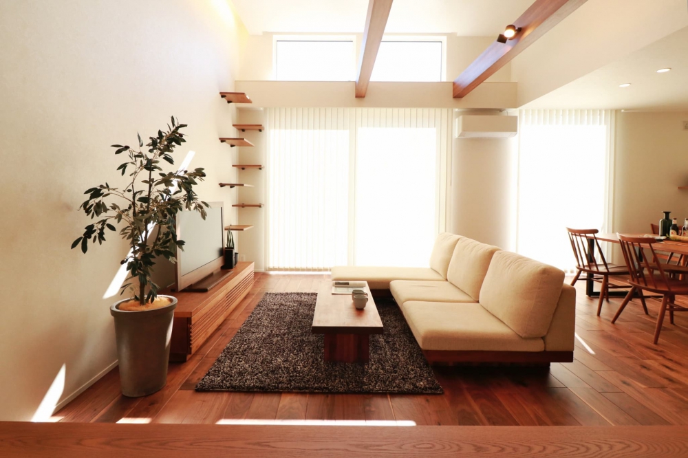 高天井の設計がリビングに広々とした開放感をもたらし、住む人に心地よいリラックス感を提供します。