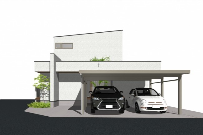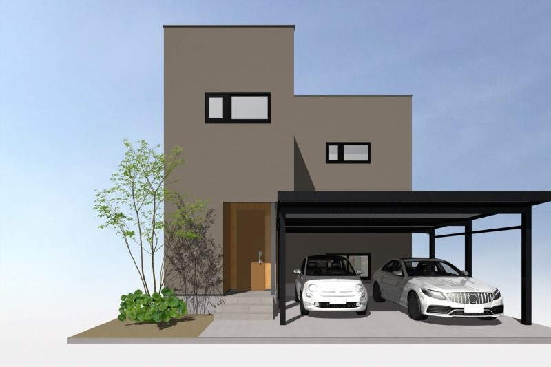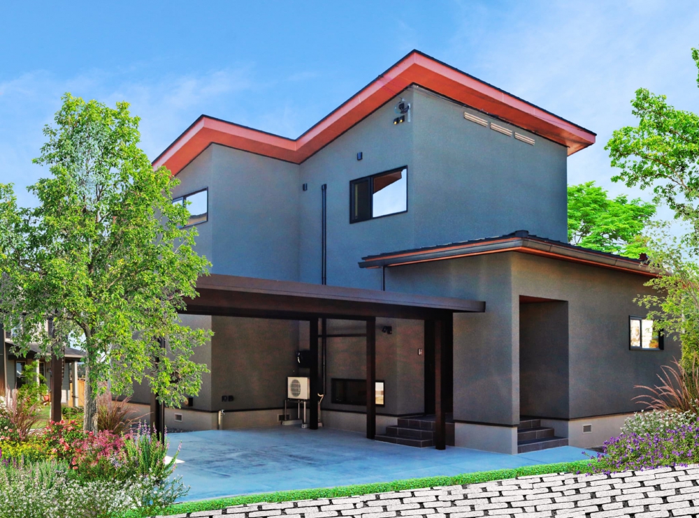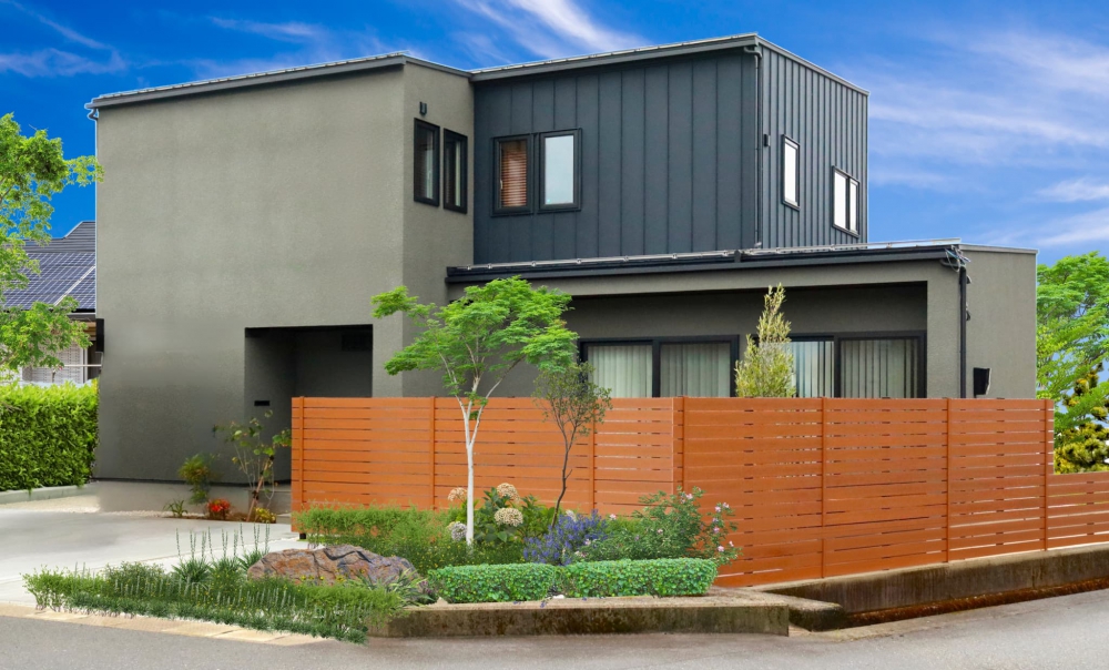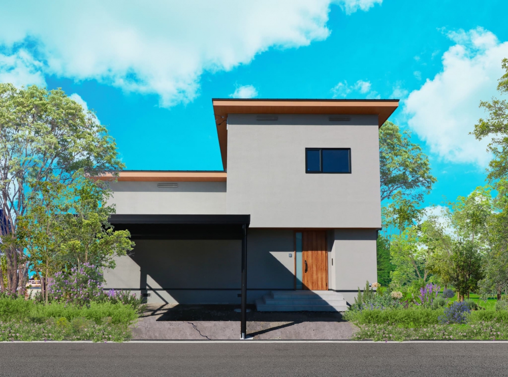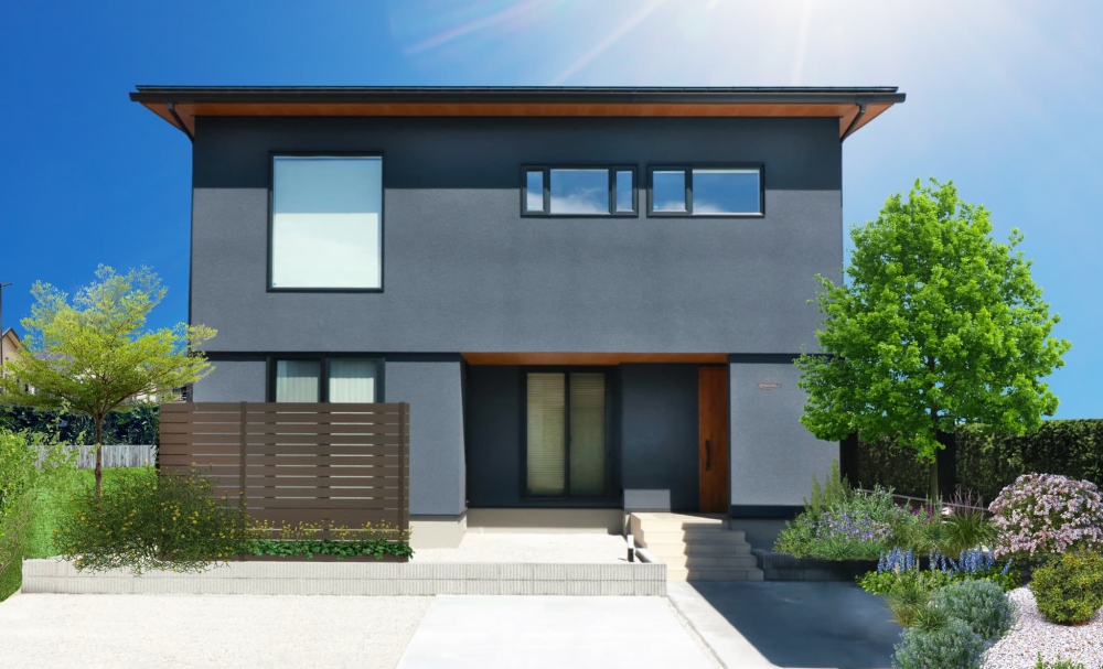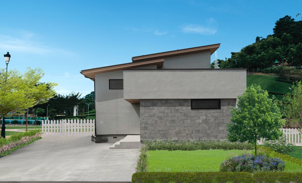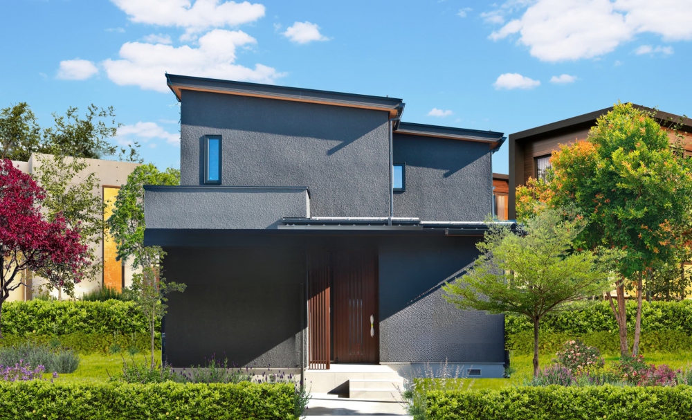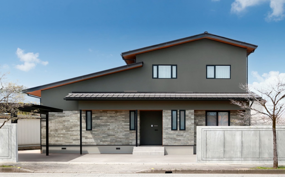 都会的なグレーの外観と、家族の優しさが伝わる温かな住まいです。