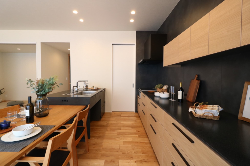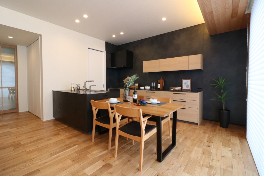 白と木目を基調に黒のアクセントを効かせたLDKと、
