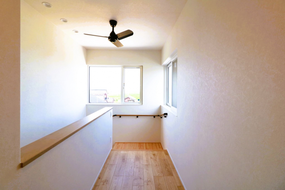 二階ホールへの階段のくりぬきが可愛らしいアクセントとなり、大人っぽさに遊び心が共存する高性能住宅です。