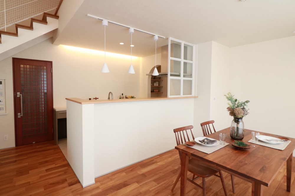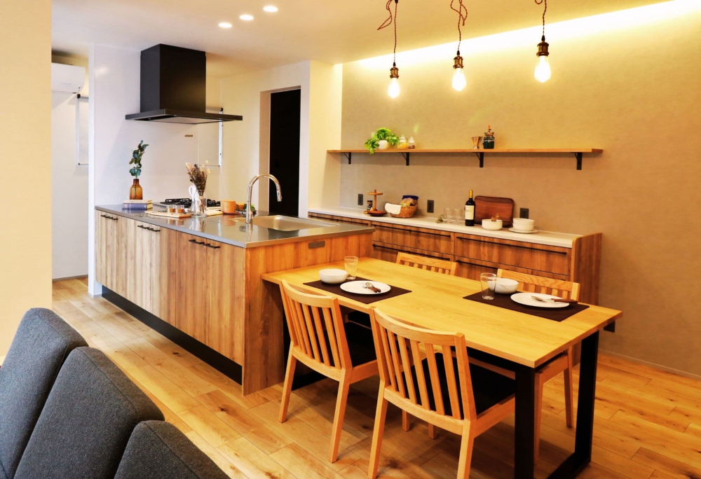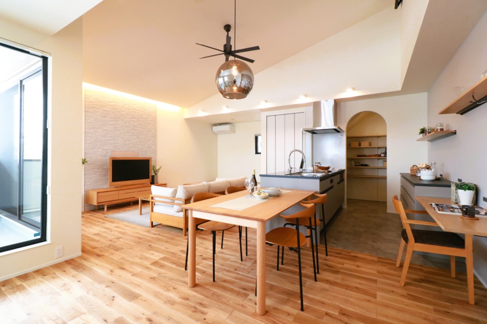 リビング、ダイニング床にナラの無垢材を使用することでナチュラルテイストの仕上げとし、アンティークな照明を使用することで落ち着きのあるインテリアとしました。