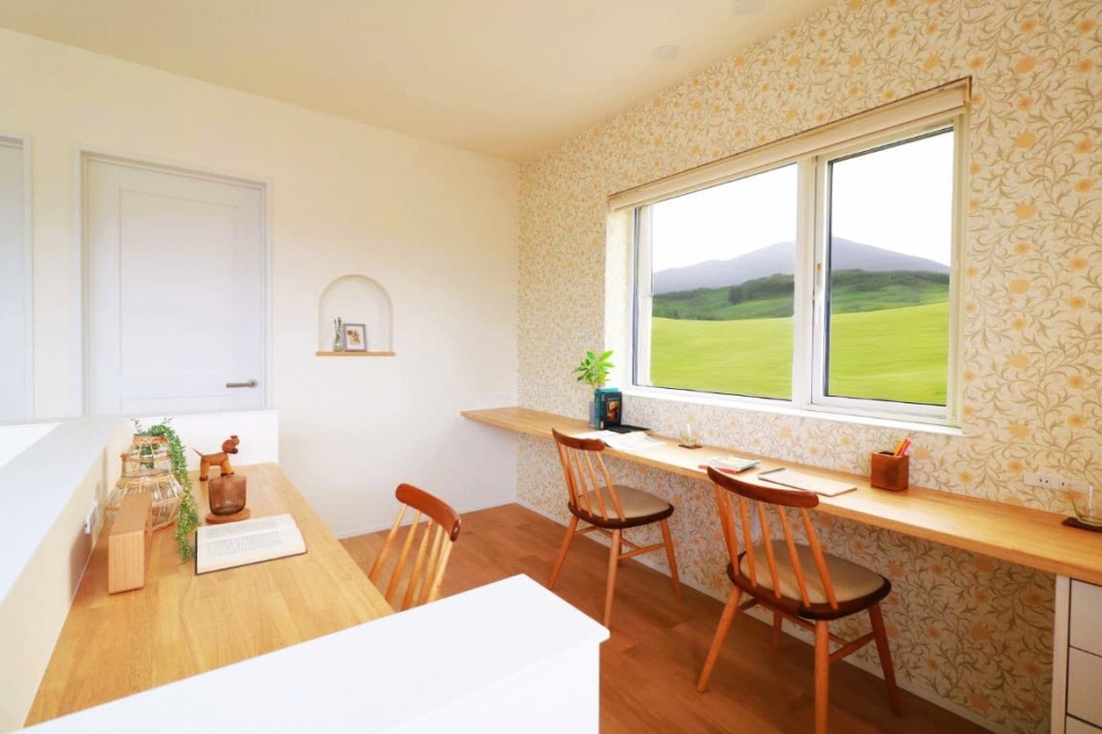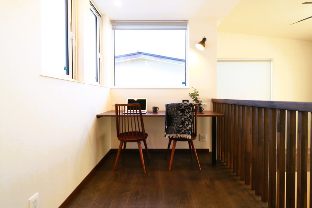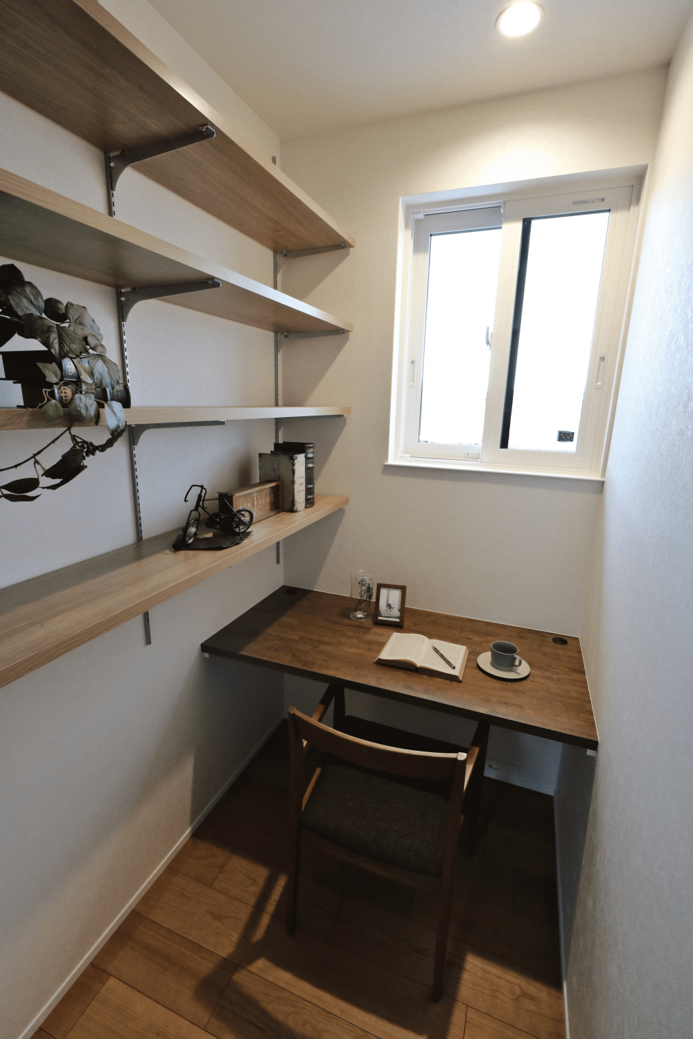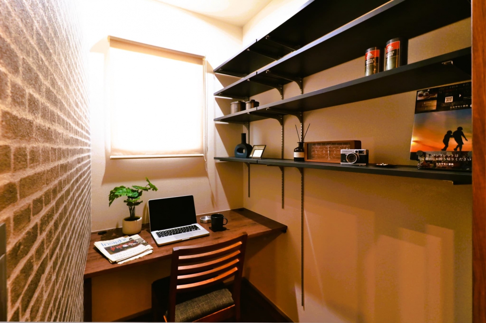 書斎は可動棚やレンガクロスがアクセントとなり、趣味と作業に最適な空間を提供します。
