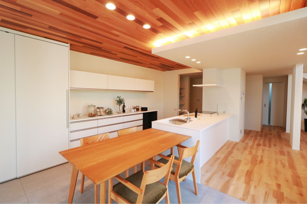 勾配天井が開放感を生み出し、効率的な家事動線が家事の負担を軽減します。