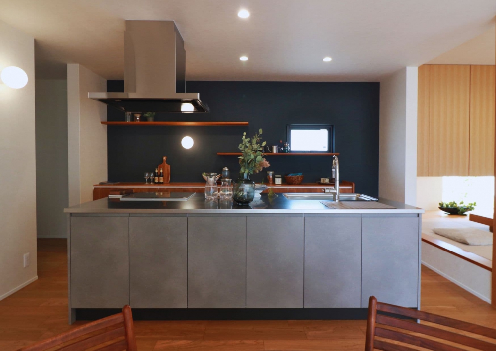グレー基調のアイランドキッチンと深いネイビーの壁紙が、都会的で洗練された印象を強調します。