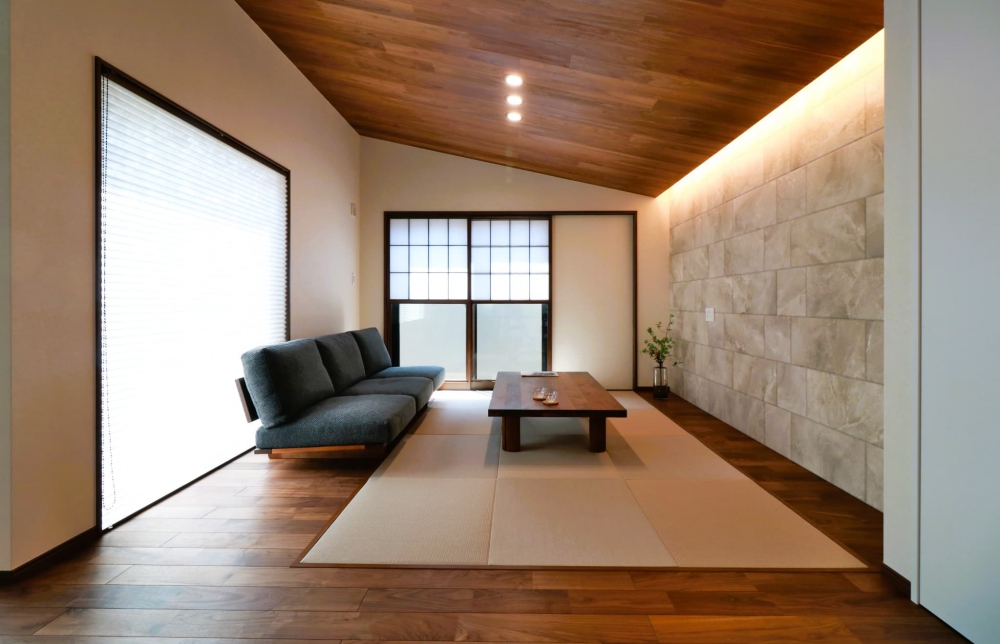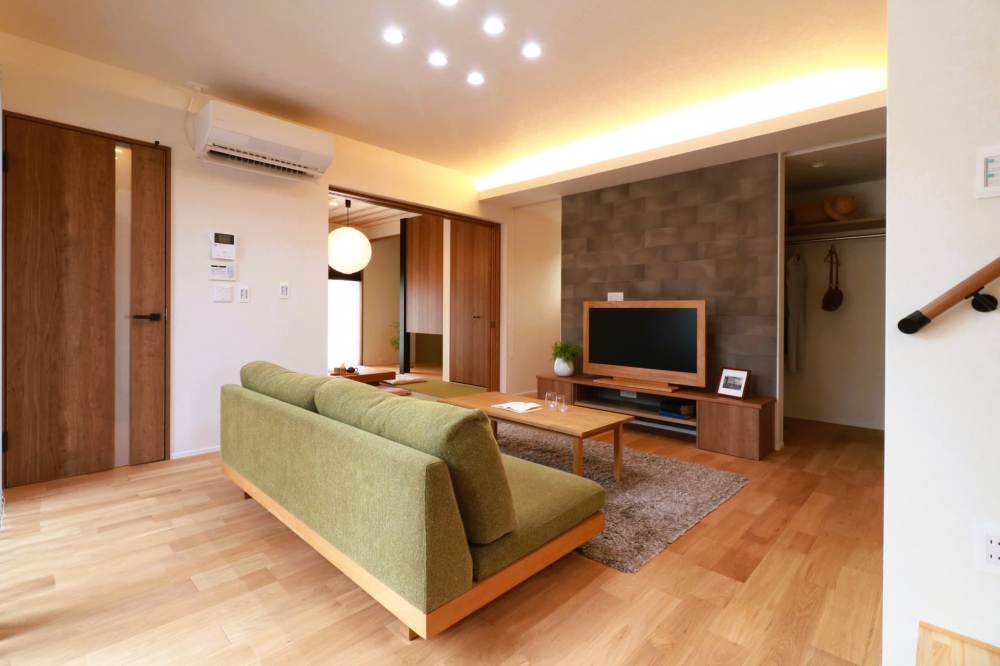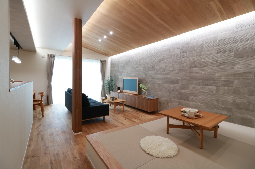 勾配天井と間接照明で開放感を演出したリビングには、視線が抜ける畳コーナーを配置。