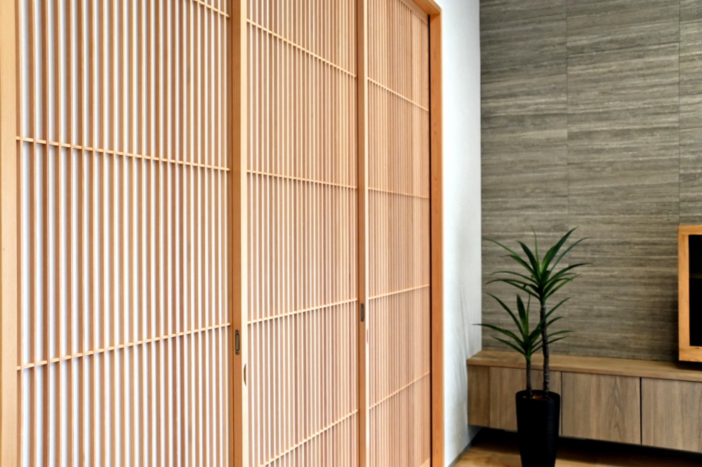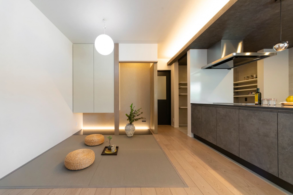 高級感あふれるLDKには、灰桜色の畳と雪見障子が調和する穏やかな和の空間が広がり、都会的なアクセントとして大胆な内装パネルが施されています。