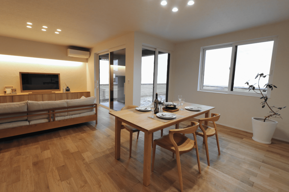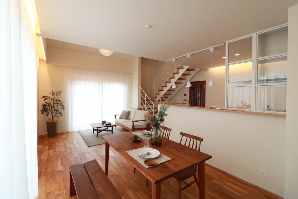 リビング・ダイニングエリアには、大きな窓が取り入れられ、外のタイルテラスとの調和があり、開放感豊かな空間を楽しめます。