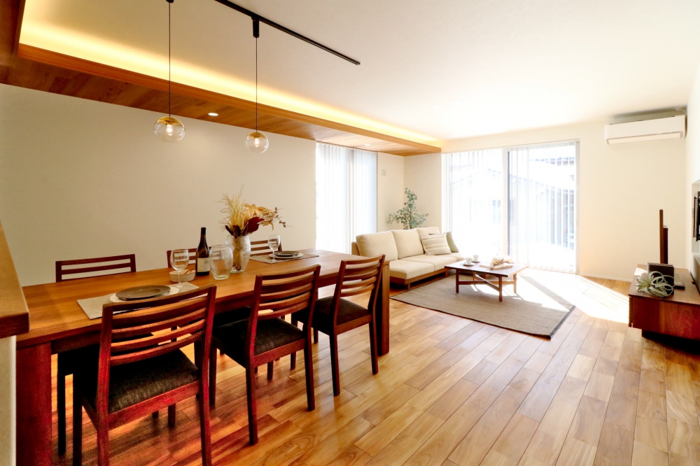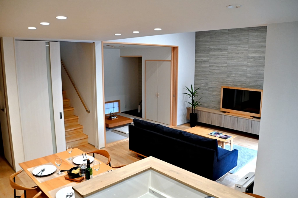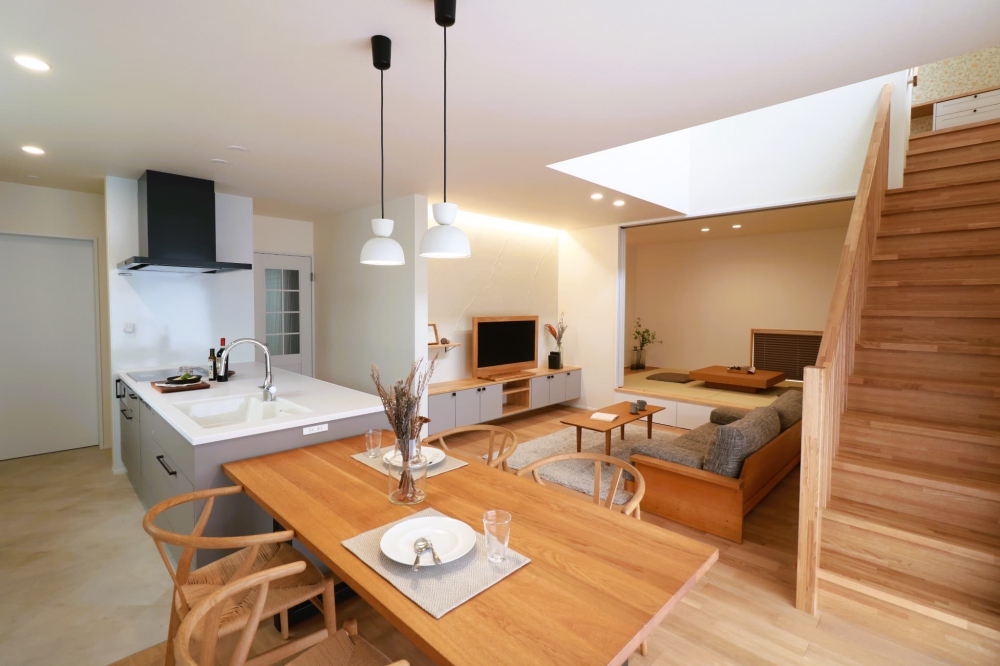 1階の広々としたLDKは和室と調和し、リラックスできる空間を演出。
