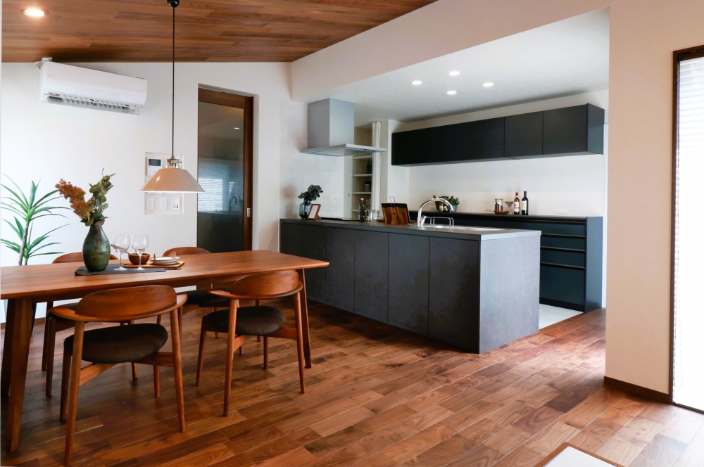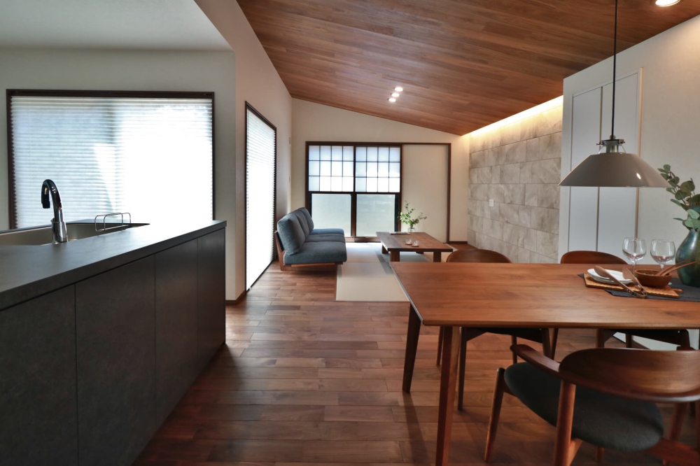 ウォルナットで統一された床板と木質天井が特徴的な美しい平屋が完成しました。