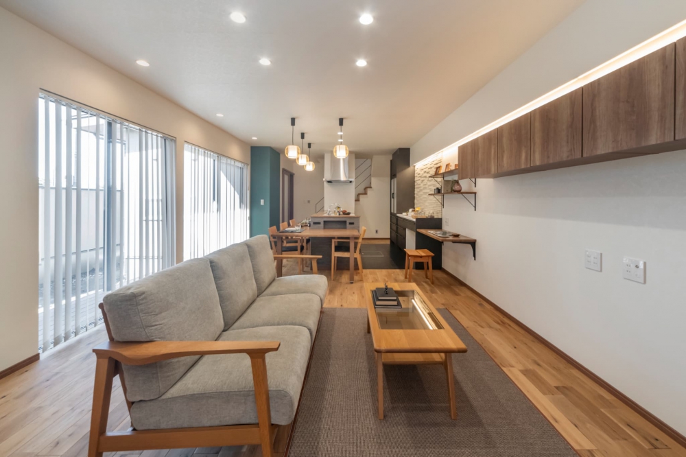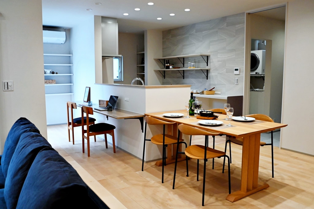 LDKにはワークスペースやウォークインクローゼットが隣接し、くつろぎと家事動線が共存。