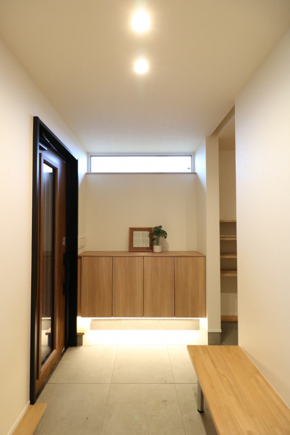 玄関からリビングと水廻りエリアへのスムーズなアクセスを提供し、効率的なデザインを実現しています。