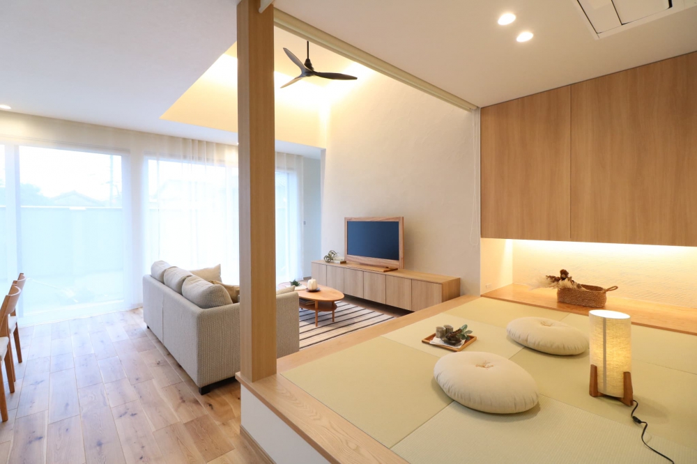 小上がりのタタミコーナーはリビングとつながり、くつろぎスペースの立体感を演出しました。