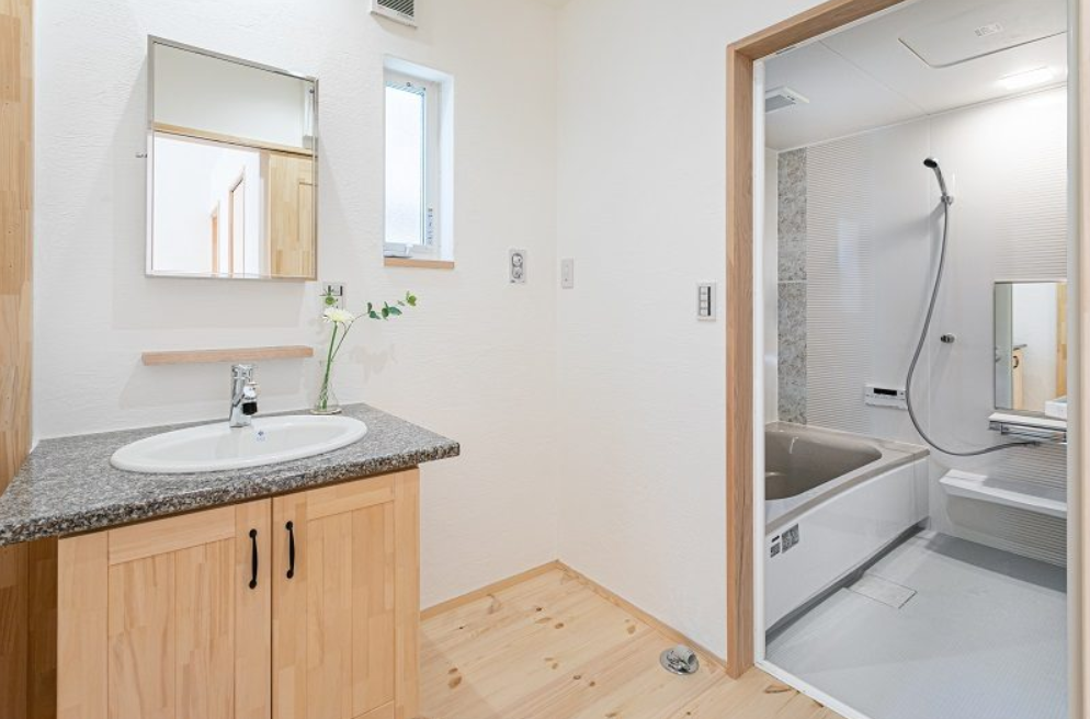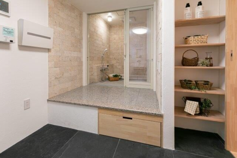 浴室手前に床から一段高くした脱衣スペースを設けました。 高さを活かした引出し収納も便利です。