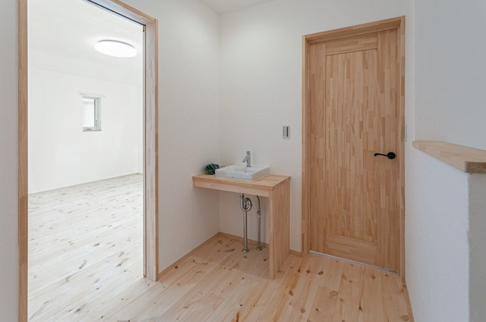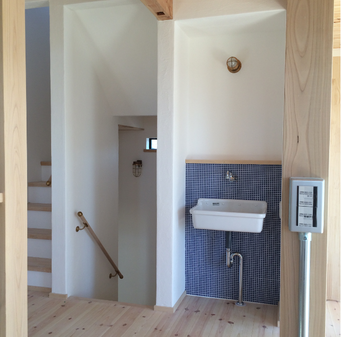 2階の階段を上がったホールに手洗いを設けました。すっきりしたデザインでインテリア性も損ないません。