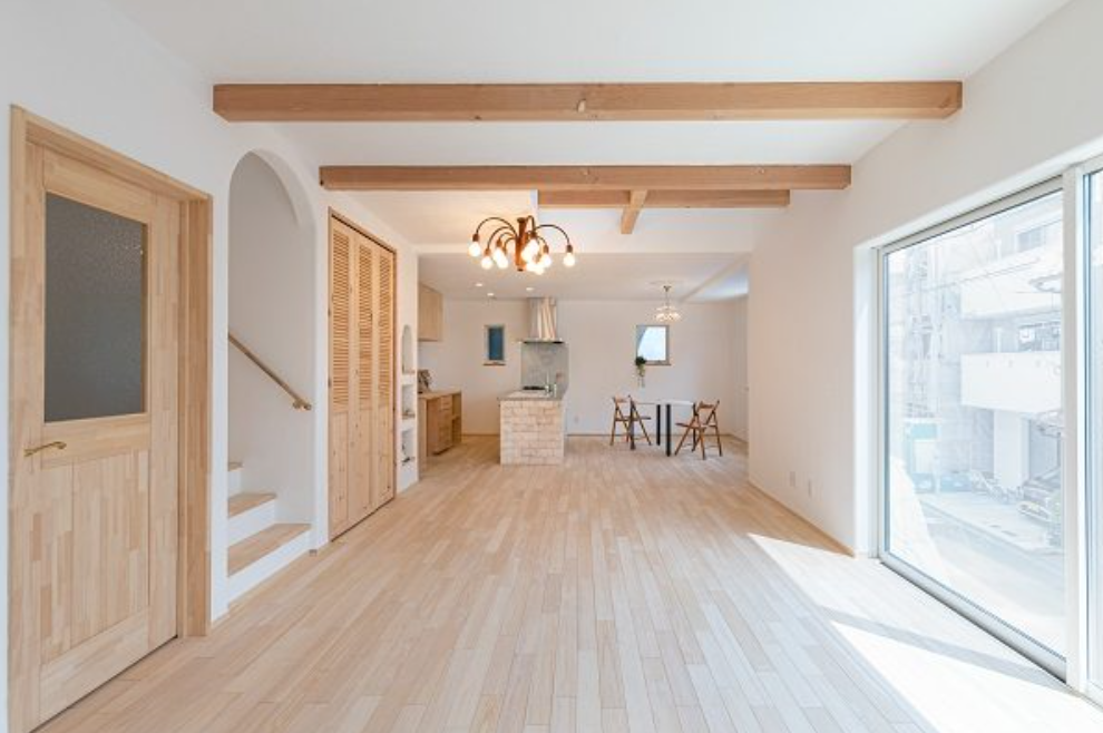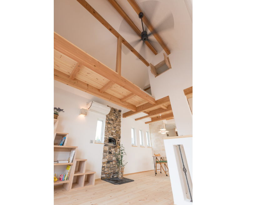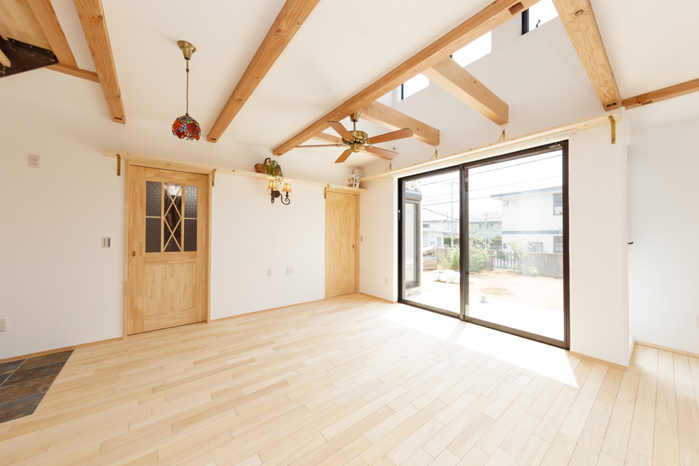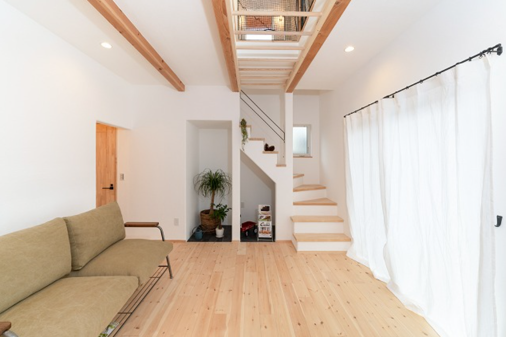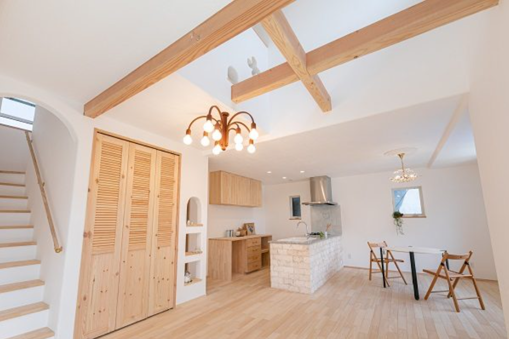 リビングの木の梁を表しにして、空間に変化を付けたLDK。