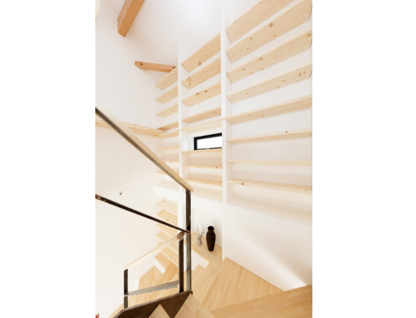 階段の途中に可動棚を設けました。踊り場がときには読書スペースに。