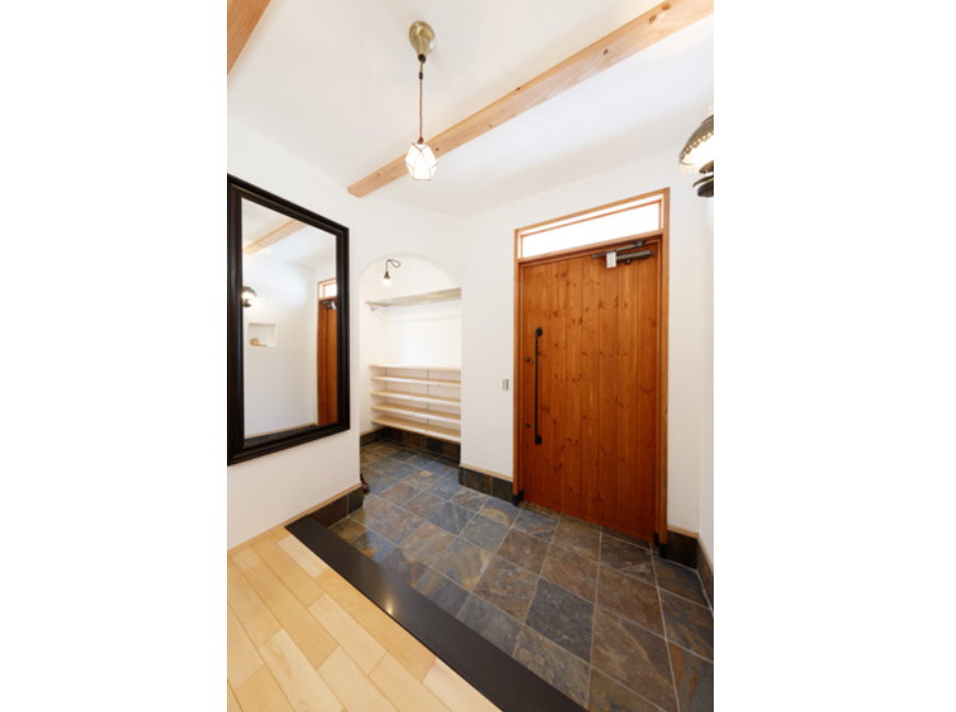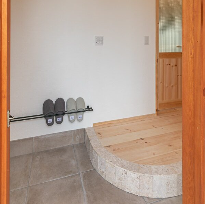 玄関を入るとコーラルストーン張りのまぁるい玄関框が出迎えてくれます。