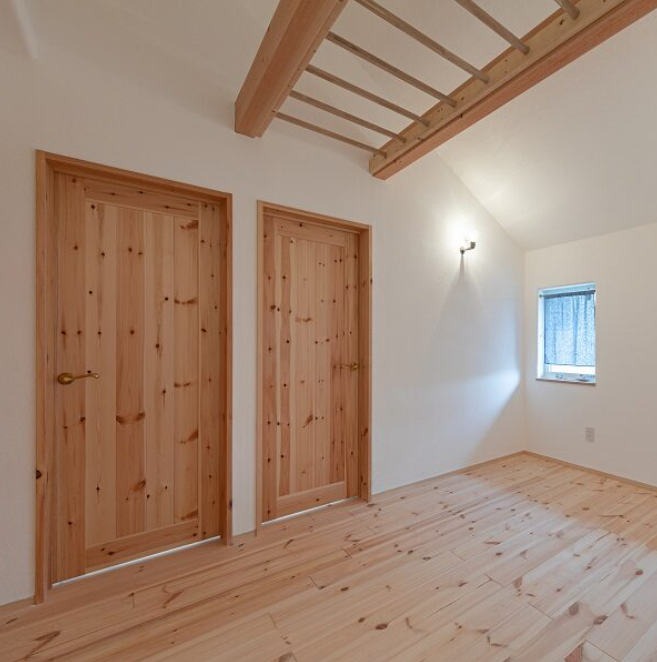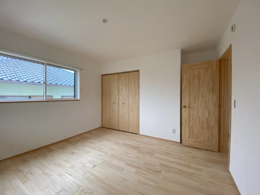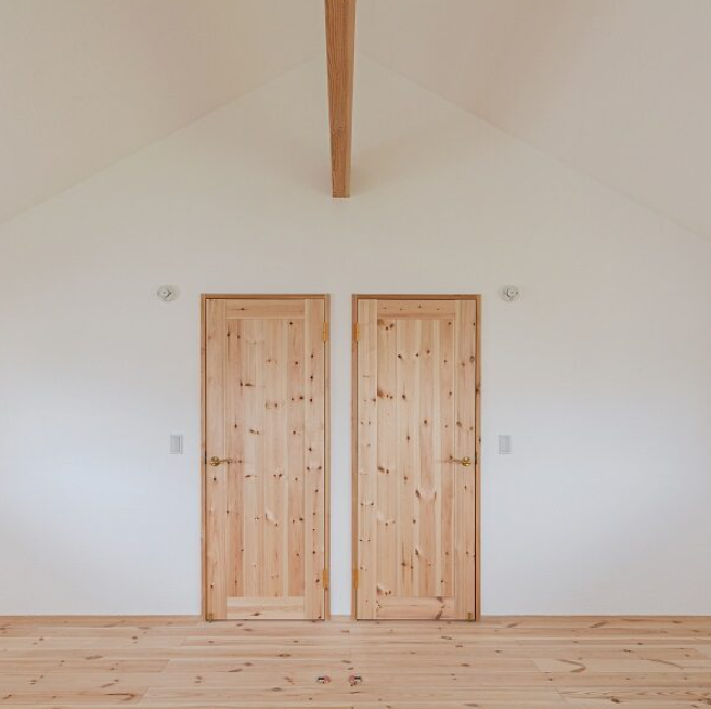 今は家族みんなで寝るので大きなお部屋として。 近い将来、個室に区切って集中して学習できる子供部屋二部屋に。 ドアも二つ。コンセントやスイッチもそれぞれのお部屋に。