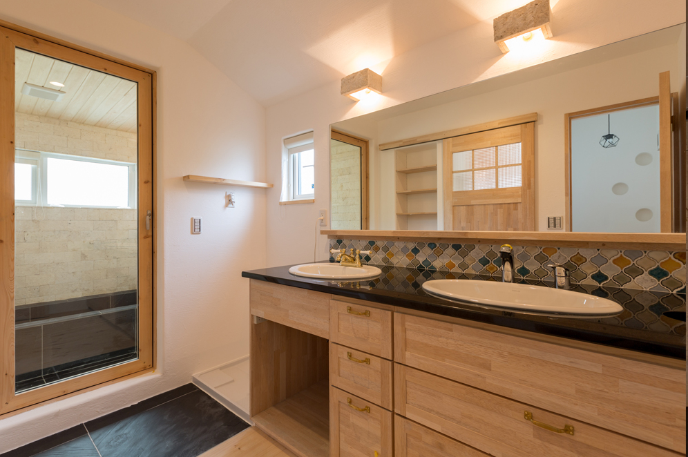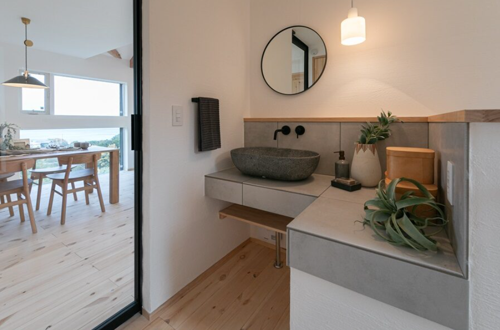 天然石としっくいと無垢の木。ナチュラルな素材をグレーのタイルや黒のアクセサリーでシックに引き締めて甘さを抑えた雰囲気に仕上がりました。