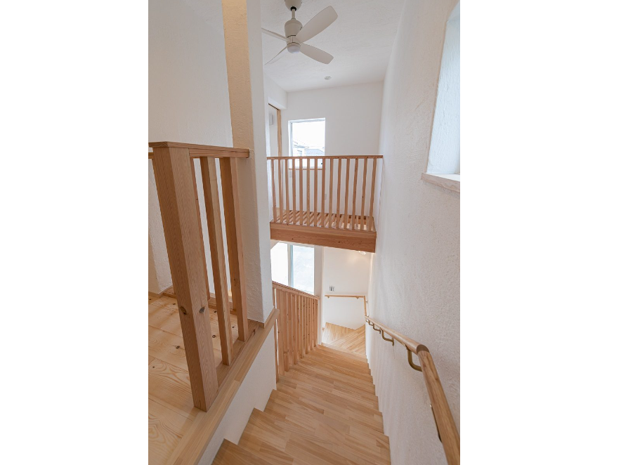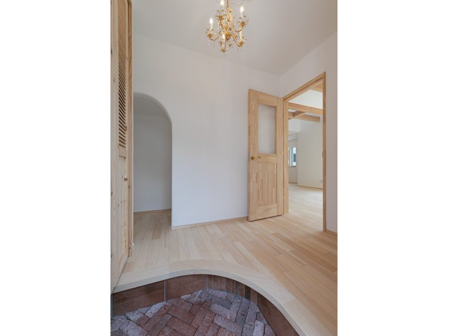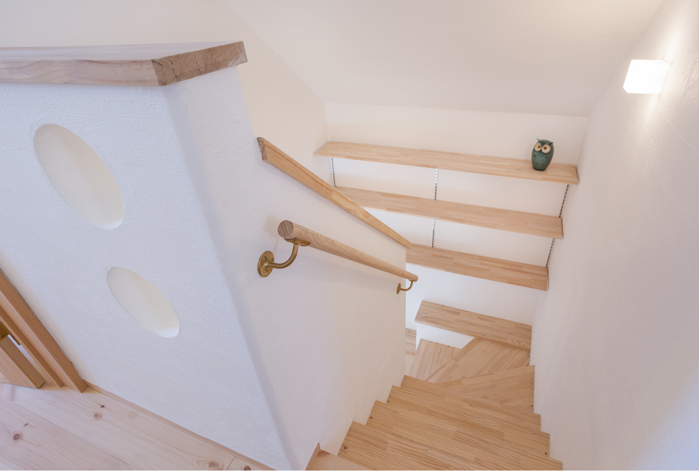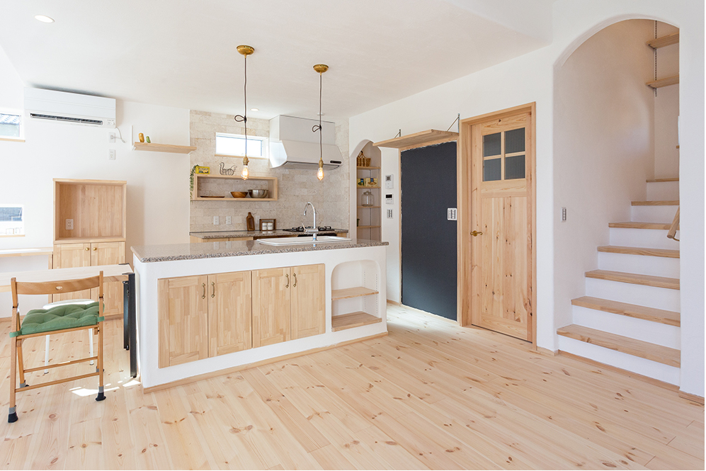階段室のアール型の垂れ壁やリビングのガラスドアがナチュラルで可愛らしい雰囲気