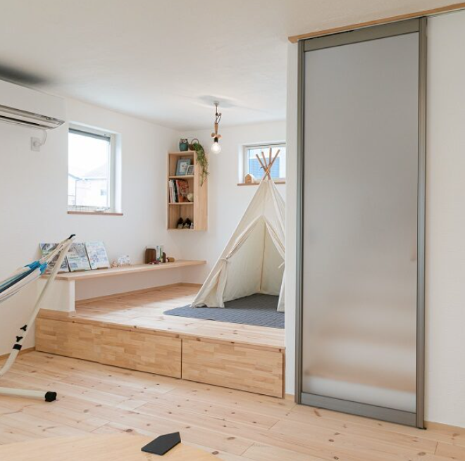 リビングに隣して設けた小上がりのスペース。アルミ枠の半透明の引き戸の向こうは階段になっています。