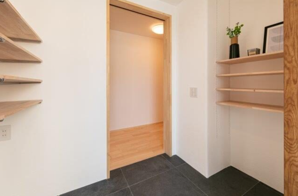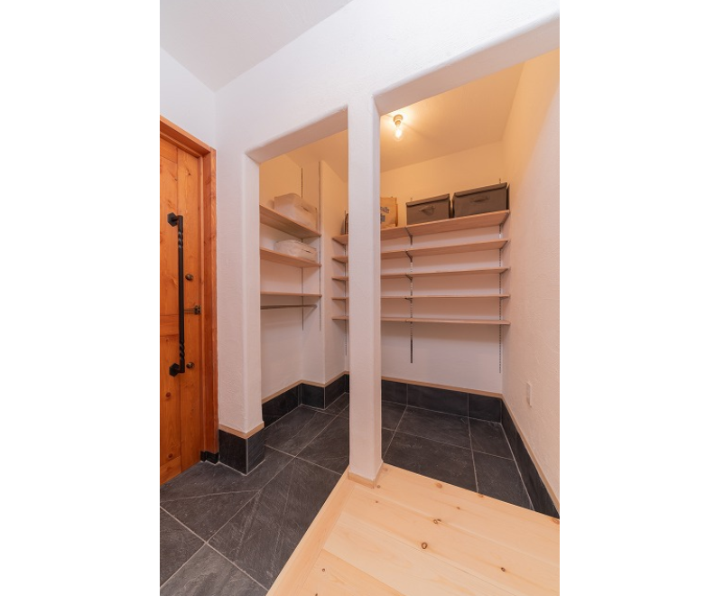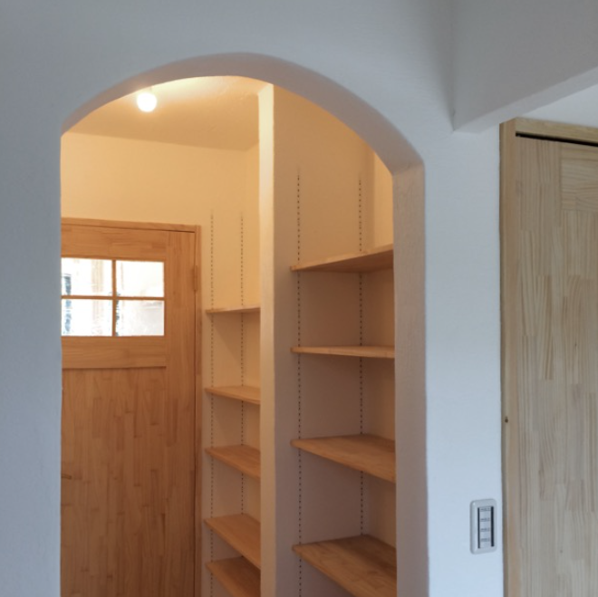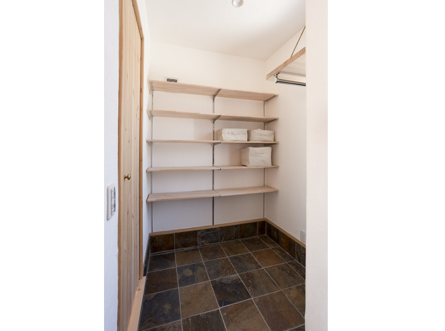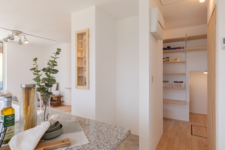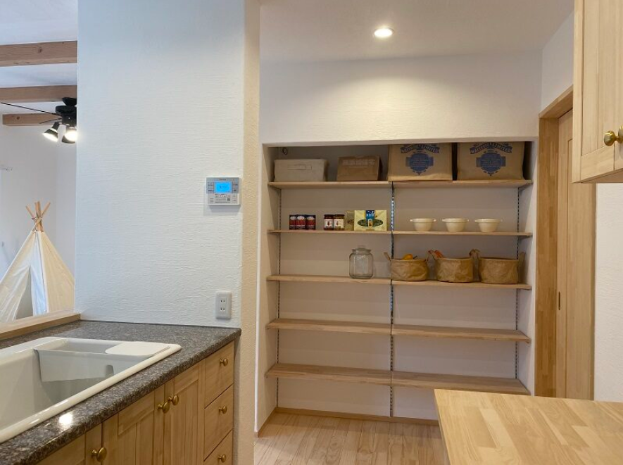 キッチンの脇に設けたパントリー収納。 奥行きを深くしすぎないのが使いやすい収納のポイント。