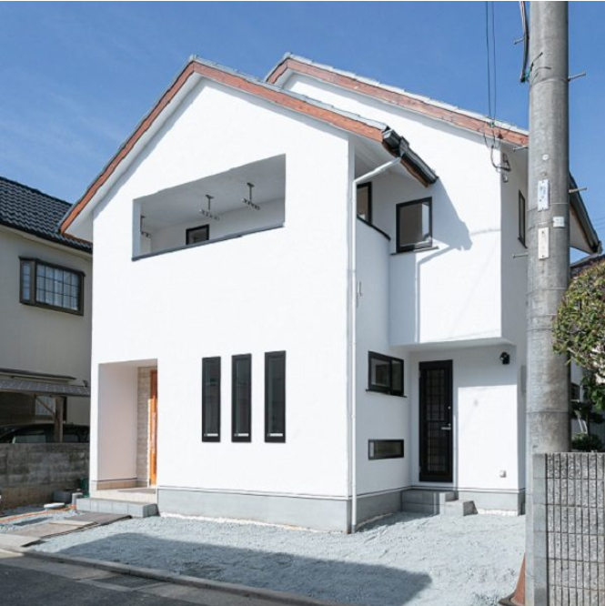 リビングのスリット窓がアクセントになった外観。まっしろなしっくいが町並みに映えます。