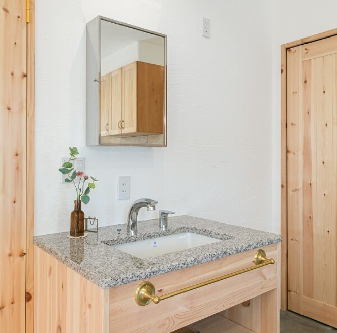 キッチンと全く同じ素材の御影石「ピーチポリーノ」で天板を作ったオリジナルの洗面化粧台。