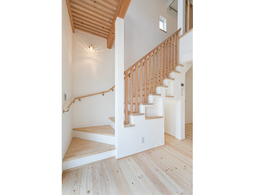 リビングから2階へと続く階段もしっくいと無垢の木でできた自然素材の美しさが際立つデザイン。