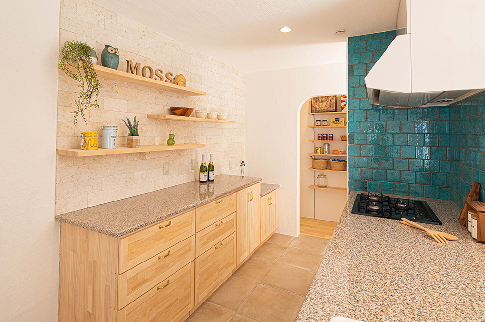 天然石ワークトップのキッチンはセパレートタイプ。 壁につけた幅広木枠の魅せ収納棚も個性的。