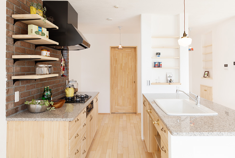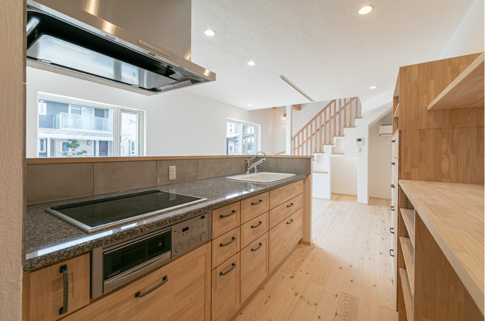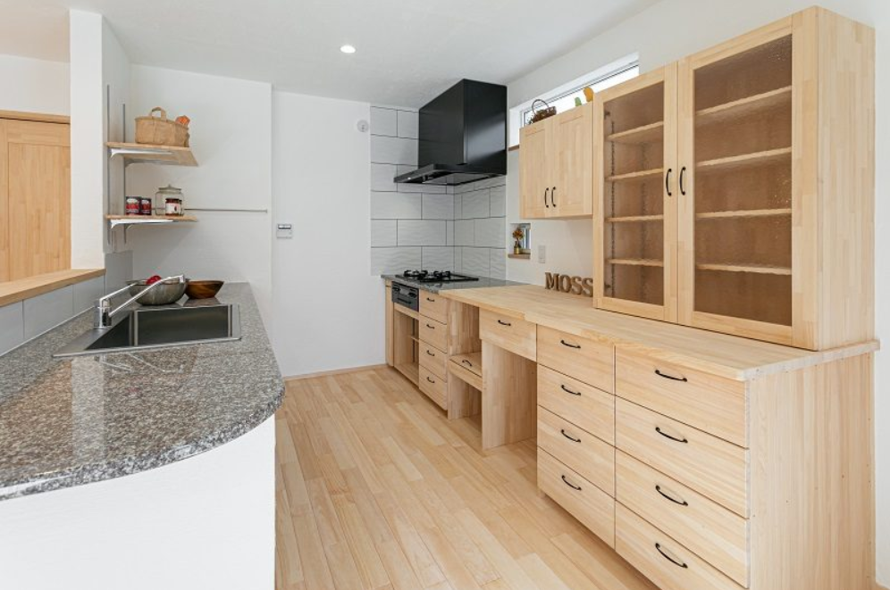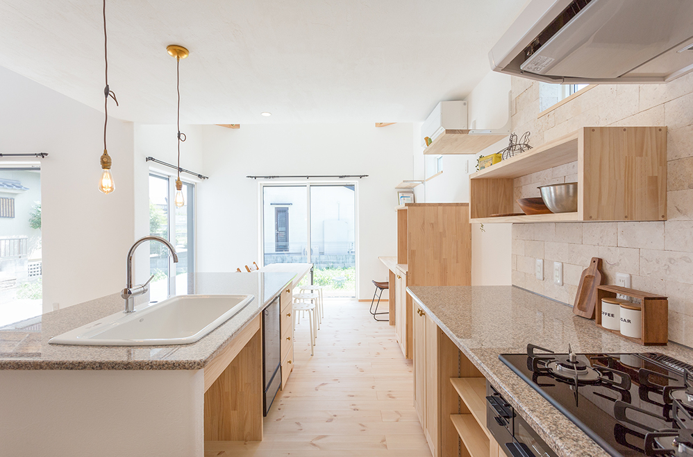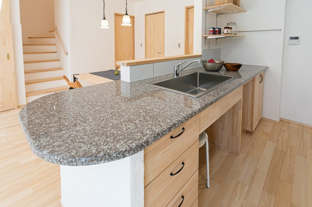 無添加住宅のキッチンは、天然御影石のワークトップと無垢の木のキャビネットでつくる造作キッチンが標準仕様。