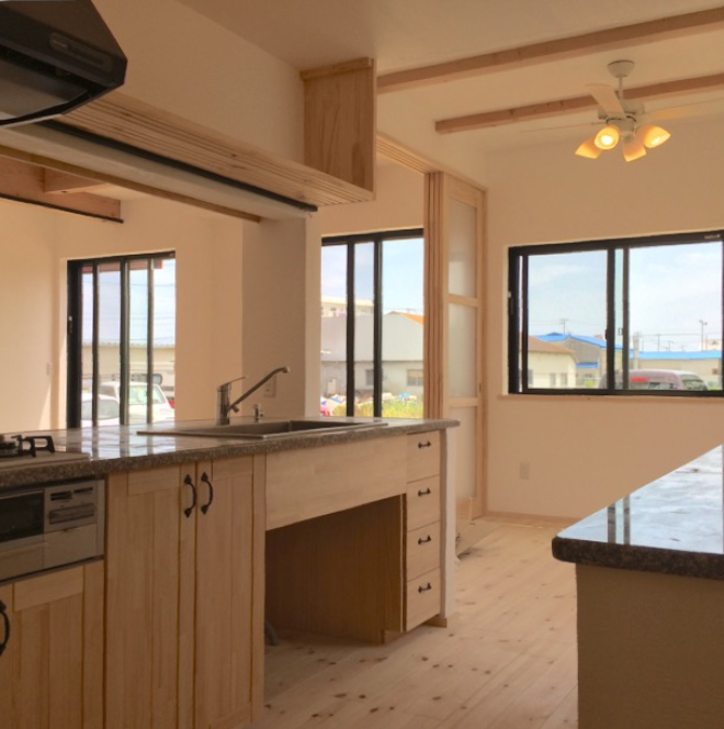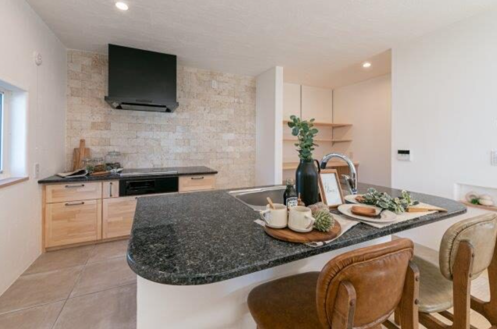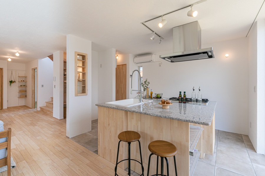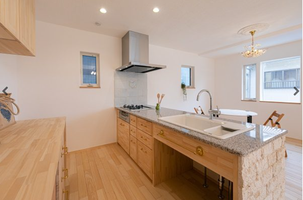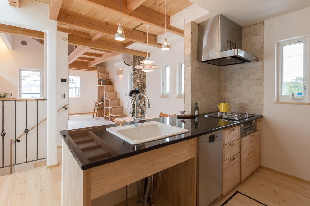 無添加住宅のキッチンは、天然御影石のワークトップと無垢の木のキャビネットでつくる造作キッチンが標準仕様。