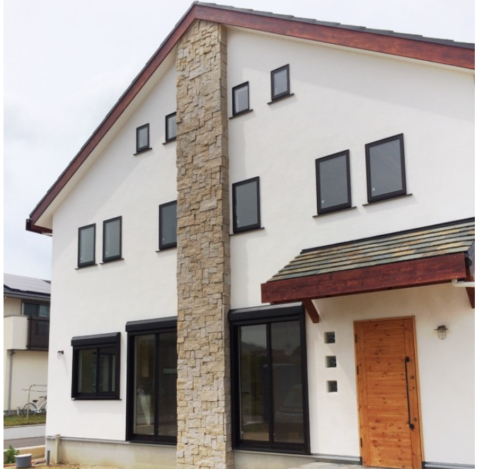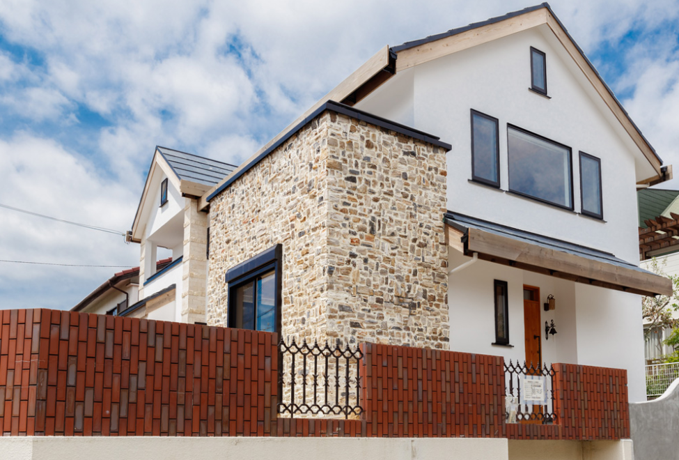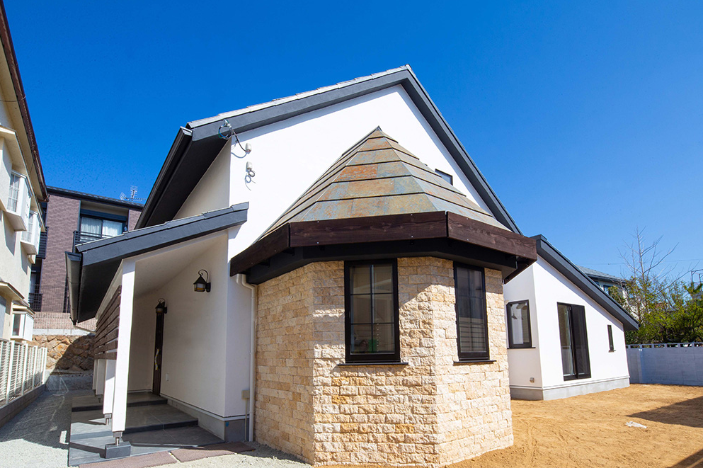 天然石「ジェラシックウッドストーン」と真っ白な漆喰のコントラストがひと際目を引く外観
