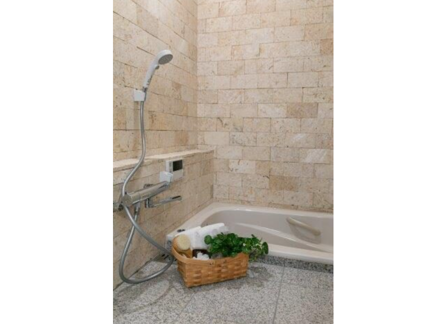 オーダーメイドの浴室は、浴槽の高さやシャワーの取付位置も自在です。 もちろん石やタイルのデザインもお好みに合わせて選択できます。