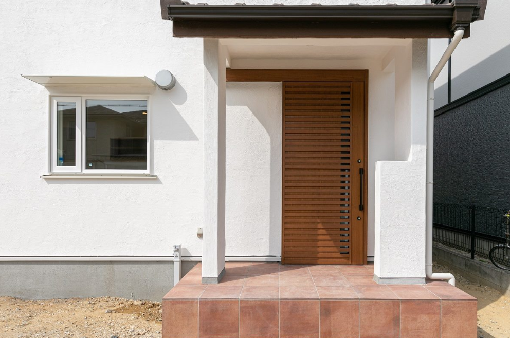 雨の日も安心な大きめのポーチ屋根がついた玄関。 荷物を持ったままの開け閉めが楽で、将来のバリアフリーにも備えた幅広の引き戸を採用しました。