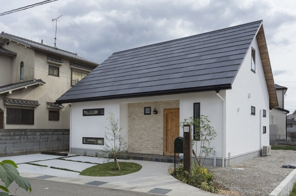 平板瓦の寄棟屋根とまっしろなしっくい壁のすっきりとした外観。