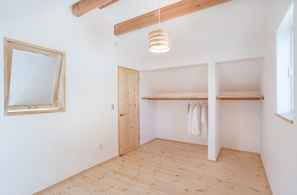 山側に設けたベッドルームには、勾配天井を柔らかく照らす間接照明や布団干し用のUの字型のバーなど、注文住宅ならではの工夫がたくさん。