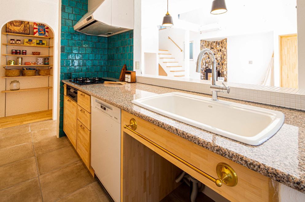 使い慣れたステンレスシンクを採用したキッチン。ダイニング側にまぁるく天然石のカウンターを張り出して、軽い食事はここでもOKな空間に。
