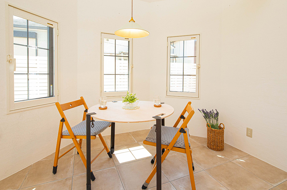 スペインタイル張りの八角形ダイニングがある家