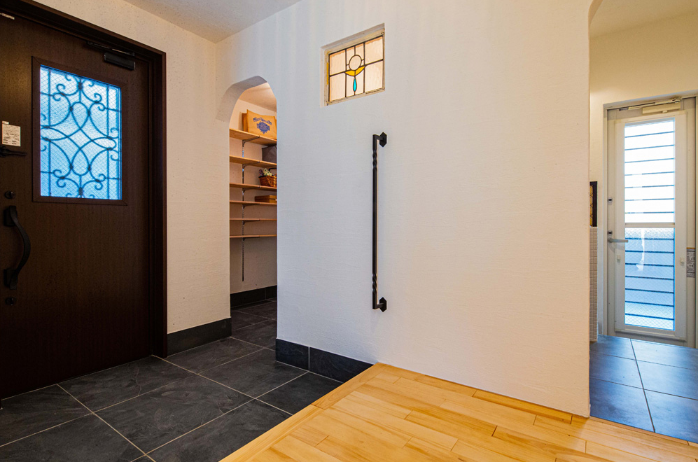 広々とした玄関にステンドグラスやアイアン手摺を配して