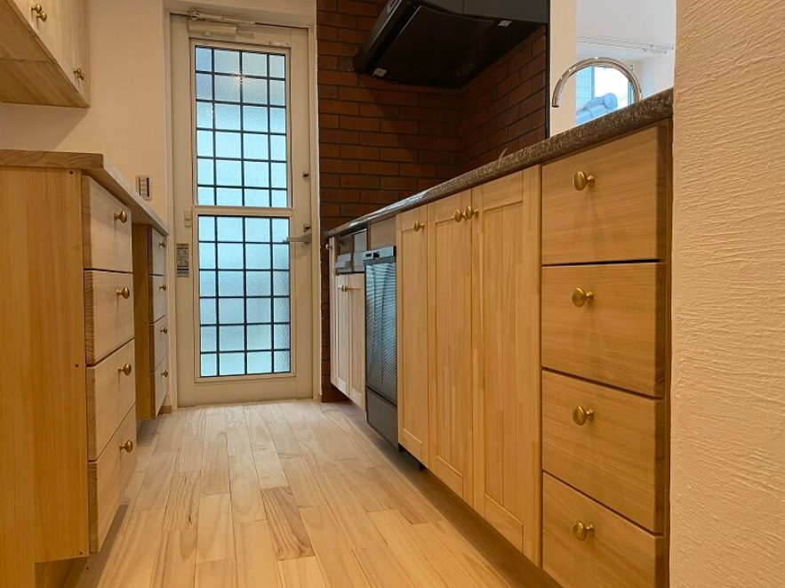 無垢の木のキッチンは、扉も中身も全てが米のりで張り合わせた天然木でできています。