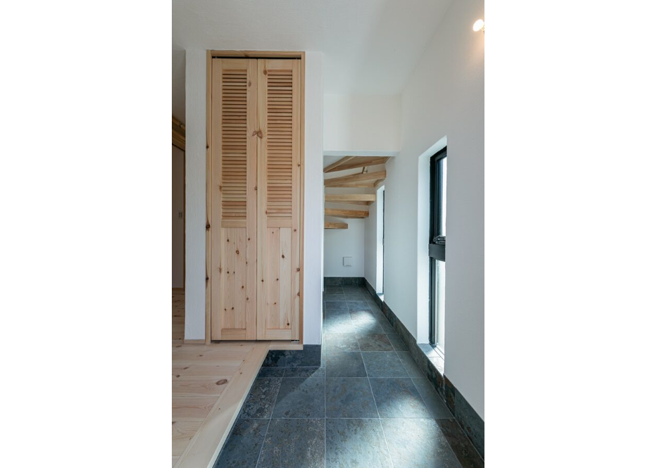 クールーフ(天然石)を階段下まで貼り延ばした玄関土間。ガラリ戸の収納裏には、土間から使う棚が隠れています。