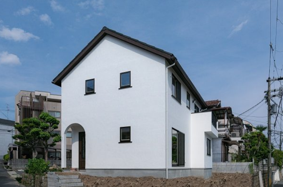 角地に建つまっ白なしっくいの家。この町のアイコンになりそうな素敵なお家になりました。