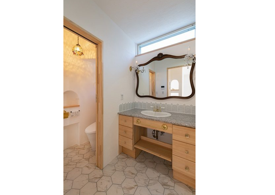 キッチンとお揃いの御影石ワークトップ。真鍮の水栓金具やアクセサリーは無添加住宅のオリジナル。 お施主様がご用意されたシャンデリアライトやアールヌーボーを彷彿とさせるミラーも素敵です。