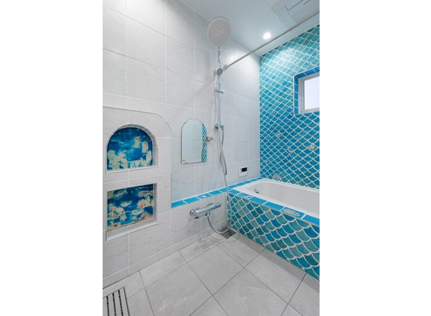 浴室は、海がモチーフ。 一枚一枚手作りされた波の形のブルーのタイル。 一枚ずつ色のグラデーションがあり、ほんものの波のようです。