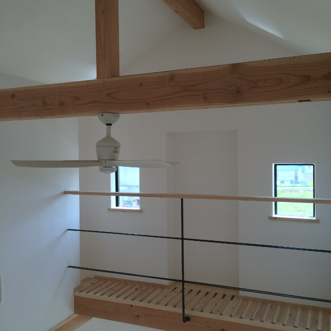 階段を上がると、天井にシーリングファン。 壁際のエアコンの風を効率よく階下へ。
