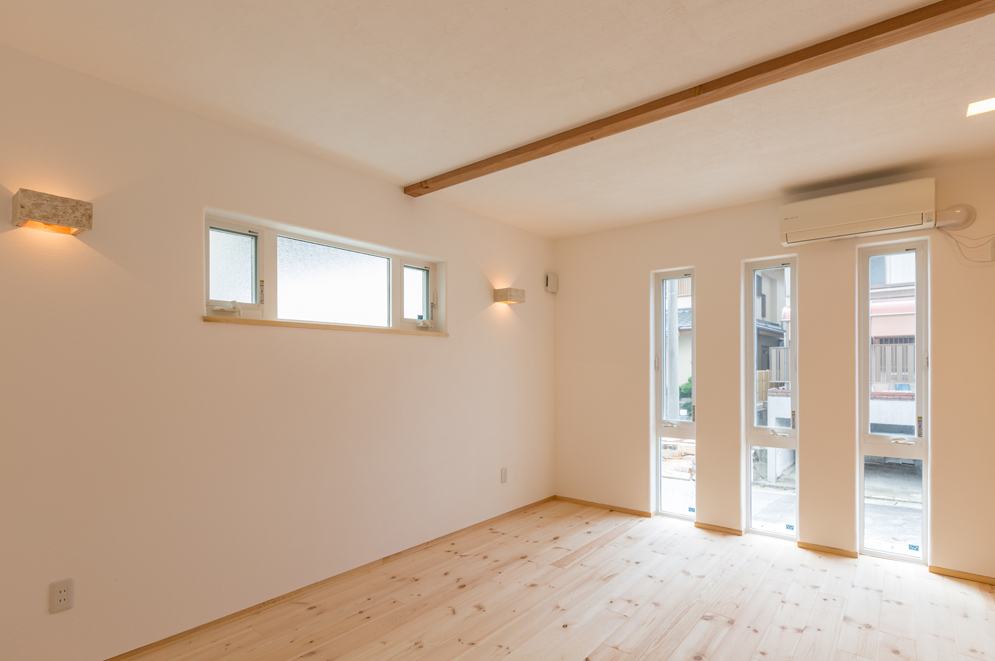 道路に面した縦長のスリット窓が明るい光をリビングにもたらします。