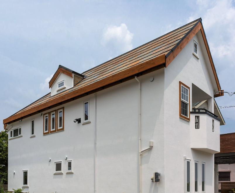 すっきりとした総二階建ての切妻屋根を基本としていますが、玄関と勝手口の屋根庇にも天然石の屋根を用い、メンテナンスなしで長持ちする無添加住宅となっています。