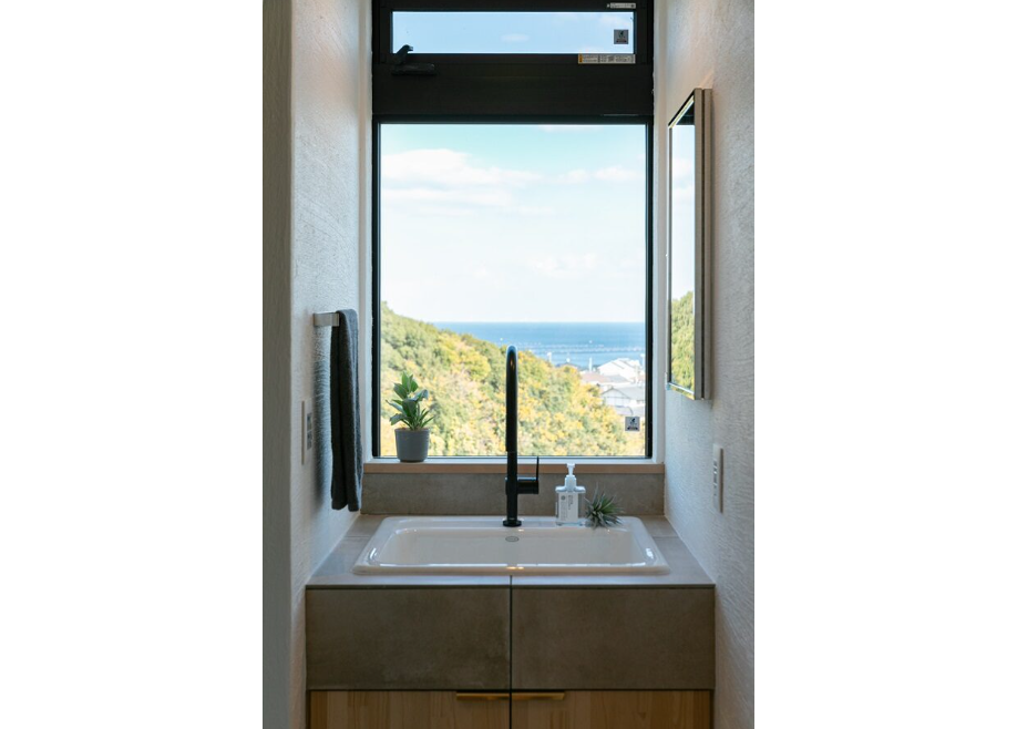 「景色を主役に」ピクチャーウィンドウを正面に据えた洗面化粧台。深めのホーローシンクは、スロップシンクとしての役割も果たせる優れもの。