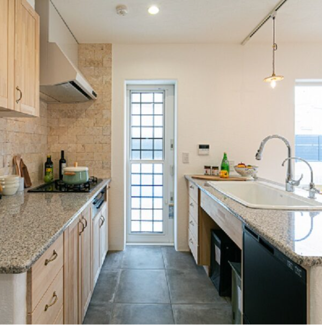 シンクとコンロを別々に設置したⅡ型レイアウトの造作キッチン。